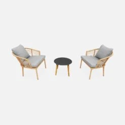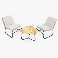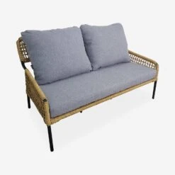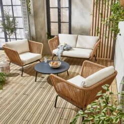 Salon De Jardin Bas Résine Tressée Effet Rotin 5 Places Couleur : Bois / Gris Chiné