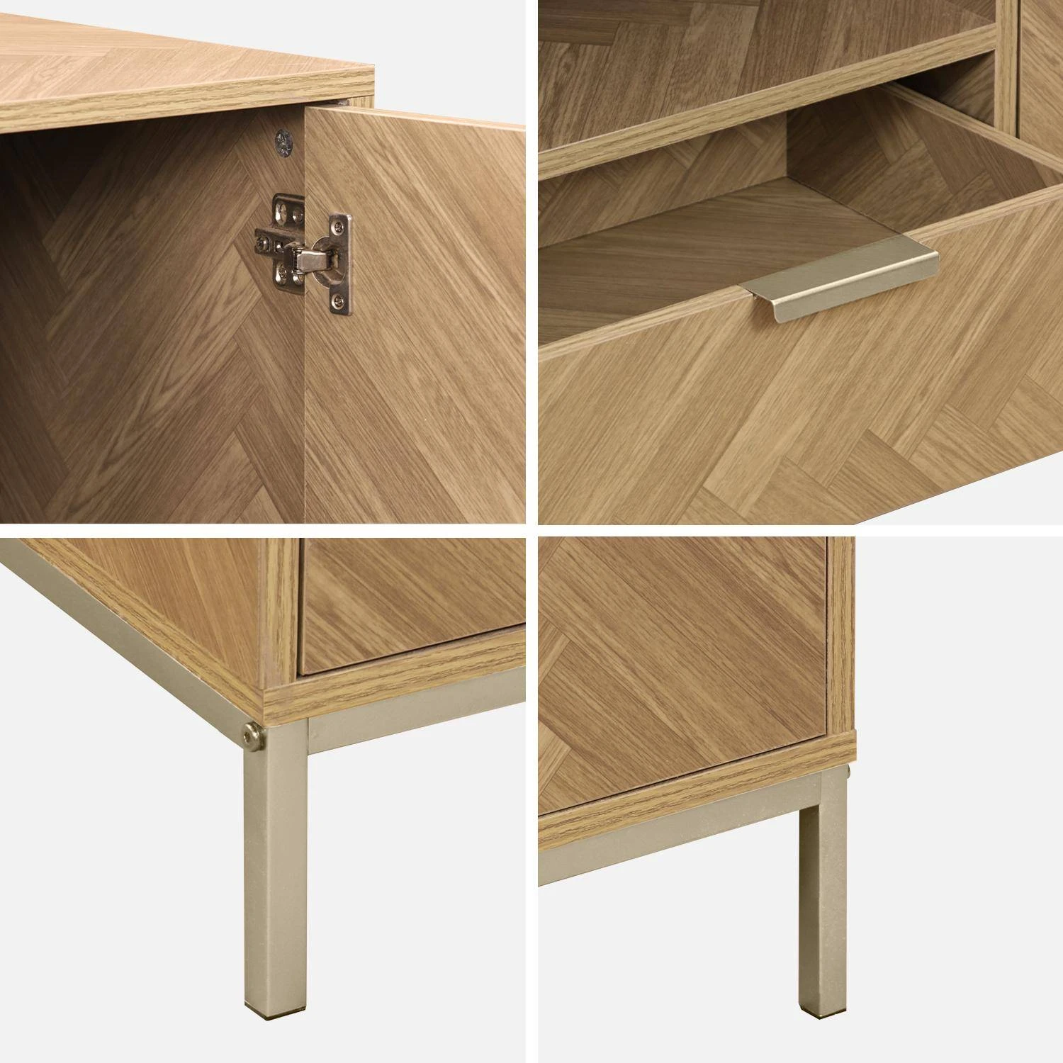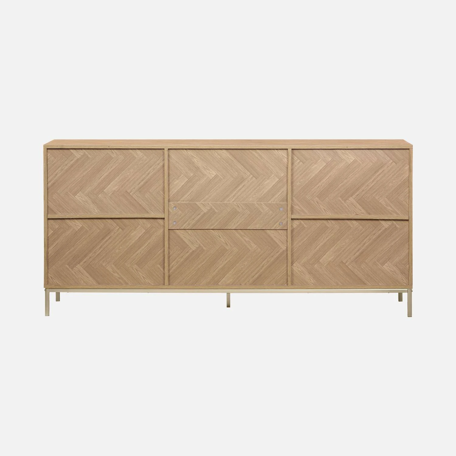 Ce meuble s’inspirant du parquet point de Hongrie est Ă la fois original et Ă©lĂ©gant. Son dĂ©cor chevrons lui apporte toute son authenticitĂ© et son raffinement. AccompagnĂ© de dĂ©tails en mĂ©tal couleur champagne sur ses poignets et piĂ©tements, ce meuble rĂ©haussera la dĂ©coration de votre intĂ©rieur. Son design plutĂŽt contemporain se fondra parfaitement Ă tous types de dĂ©co.Â