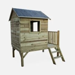 Cette maison en bois bénéficie d’une très belle luminosité, grâce aux deux encadrements de fenêtre et à la porte avec battant dont elle est dotée. La cabane est sur pilotis et possède un beau balcon avec un escalier d’un côté et un toboggan de l’autre.