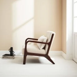 Ce fauteuil aux lignes arrondies est une invitation au cocooning. Avec son revêtement bouclette tout doux, effet laine de mouton, vous n’aurez qu’une envie, vous blottir dans ce petit cocon. Sa structure en bois solide est chaleureuse et son coloris naturel apporte un côté épuré et zen à votre intérieur. Son dossier et son assise, garnie d’une mousse de 6.5cm d’épaisseur, profonde et ferme contribueront grandement à votre confort. Ses pieds arrière, inclinés, accentueront l’aspect relaxant de ce fauteuil. Un coussin rectangulaire conçu dans la même matière vient compléter l’ensemble.