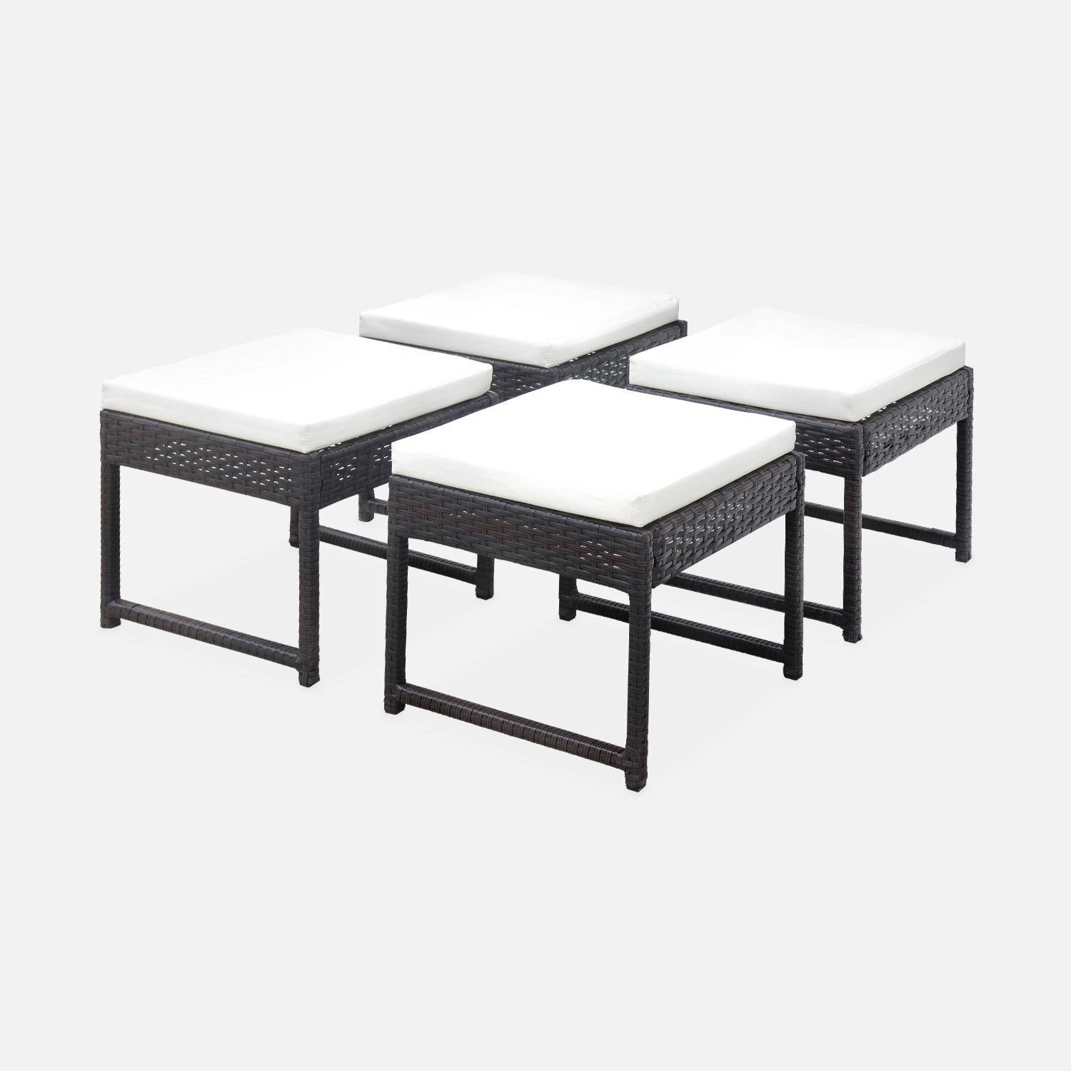 Quoi de mieux que 4 poufs pour complĂ©ter l’assise de votre table lors de vos repas en extĂ©rieur ? Ces poufs lĂ©gers sont confortables et pratiques. Leur jolie structure en acier galvanisĂ© vous permet de les dĂ©placer facilement et leur matiĂšre est Ă la fois robuste et peu corrosive. Leurs petits cousins dĂ©houssables et dĂ©perlants ainsi que leurs pieds ajustables leur apportent tout le confort dont vous vous aurez besoins pour ĂȘtre Ă lâaise ! Leur petite taille vous permet Ă©galement de pouvoir les encastrer sous les chaises de la table afin d’optimiser au maximum votre espace. Pour un rendu plus design et esthĂ©tique, une rĂ©sine plate tressĂ©e recouvre Ă©galement la structure des poufs !Â
