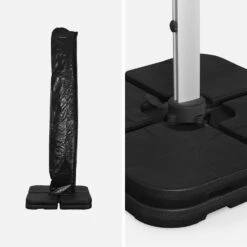 Il est indispensable de lester votre parasol (au moins 80kg). Des dalles de parasol sont disponibles dans notre catalogue. Vous trouverez également des lests spéciaux en béton (40x40cm à 50x50cm) dans les grandes surfaces de bricolage.