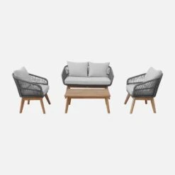 Composé d’un canapé, de deux fauteuils et d’une table basse, le salon de jardin Rosario accueille confortablement 4 personnes. Fabriqué à partir de corde et de bois dans des tons naturels, il a un style résolument scandinave et est conçu avec des matériaux qui se combinent parfaitement. Ses pieds obliques lui donnent en plus un petit côté rétro. Elégant, ce salon de jardin trouve sa place à l’intérieur comme à l’extérieur.