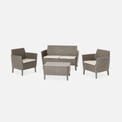 Les assises de ce salon permettront d’accueillir 4 convives, idĂ©al pour un apĂ©ro entre amis. Aucune matiĂšre sensible, il sera donc trĂšs facile de l’entretenir. Sa couleur cappuccino est tendance et s’accommodera Ă tous les styles. Ces assises sont livrĂ©es avec des coussins qu’il sera aisĂ© de ranger en temps de pluie grĂące Ă la table basse dotĂ© d’un plateau amovible.Â