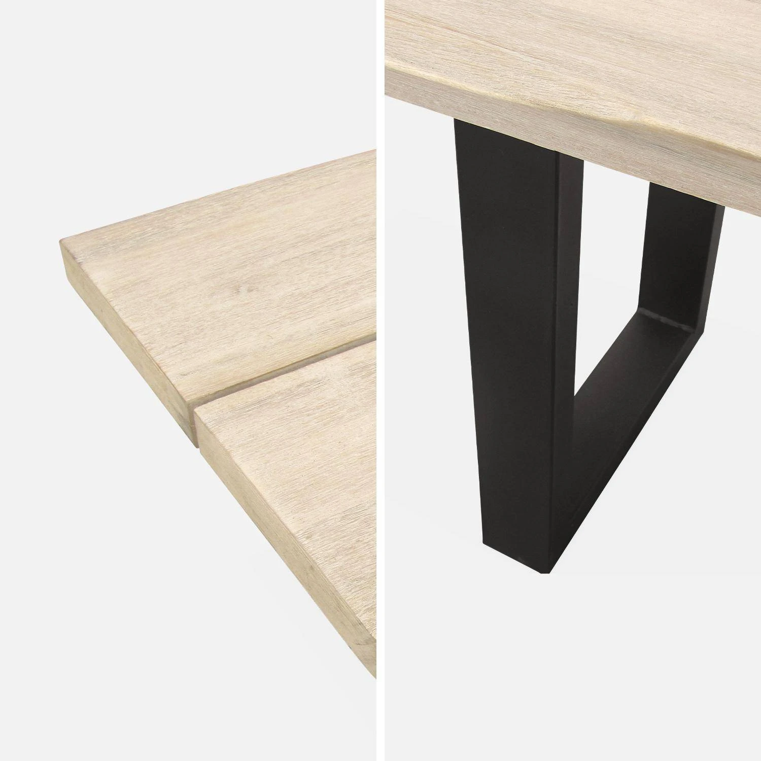 Le plateau de la table est en acacia, un bois solide. En plus, il est certifié 100% FSC ce qui veut dire qu’il garantit le respect de l’environnement et de la gestion durable des forêts. Le piètement traîneau apporte stabilité et résistance à la structure. Il est en acier galvanisé.