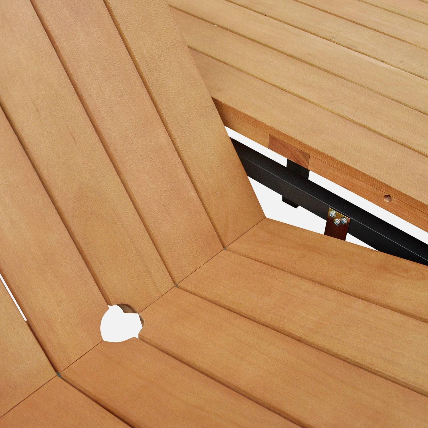 Avec un mix de bois et d’aluminium, la table de jardin Sevilla est résolument contemporaine. Chic et épurée, elle trouve sa place facilement dans tous les environnements. Pratique, la table est extensible. Elle passe de 2m à 2,5m pour recevoir plus de convives. Pour ce faire, il suffit de tirer les extrémités de la table et de déplier la rallonge papillon intégrée. Lorsqu’elle est étendue, la table peut accueillir en son centre un parasol dont le diamètre de dépasse pas 50 mm.